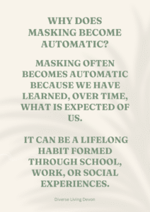 For many neurodivergent people, masking is a protective skill — something we learn to stay safe, cope, or fit into environments that weren’t built with us in mind.